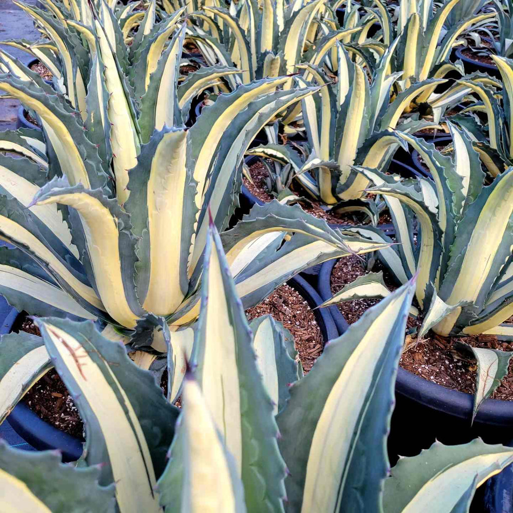 The White-Striped Century Plant is a medium-sized century plant with a bold creamy-white central stripe and blue-green margins. Yellow-green flowers attract hummingbirds when the plant is mature. Low to moderate water use during the summer, and little to no water is needed from fall through early spring months.