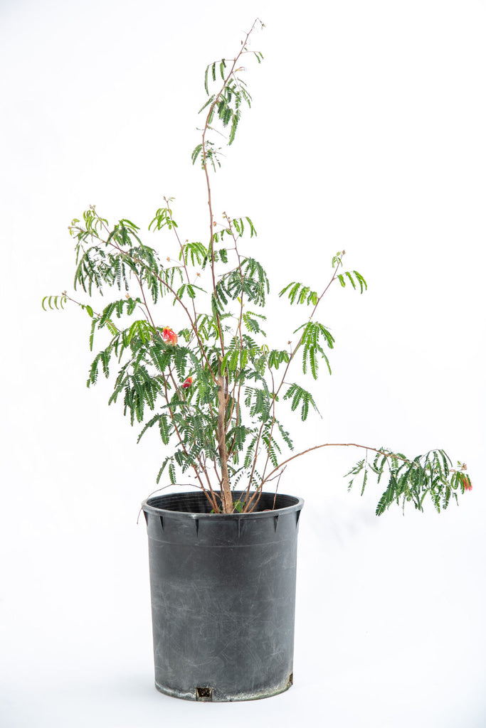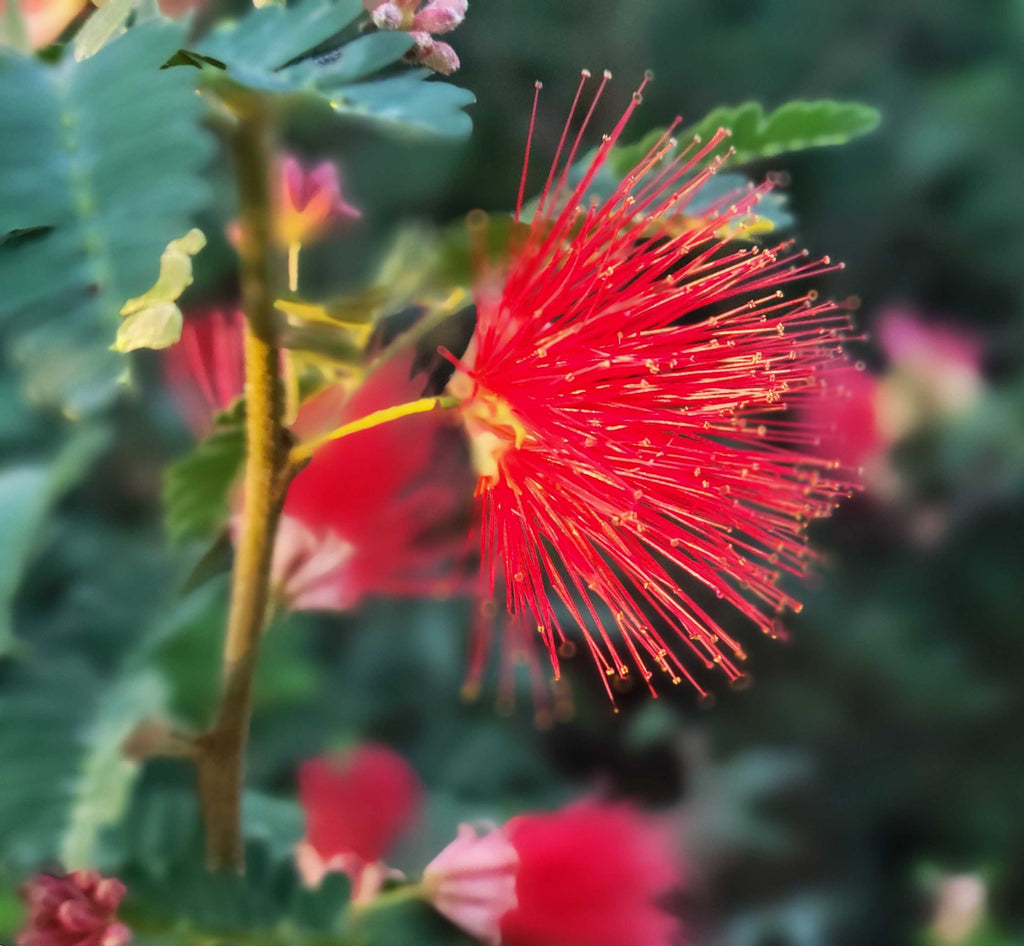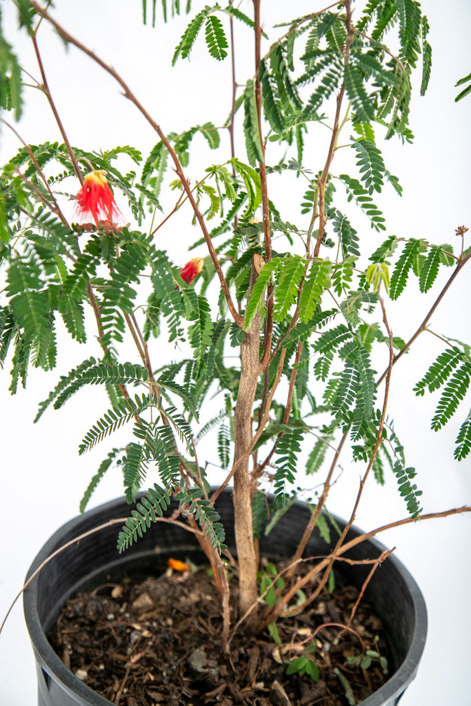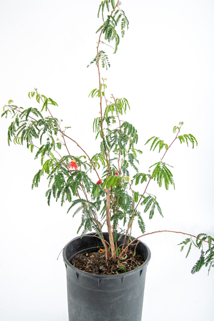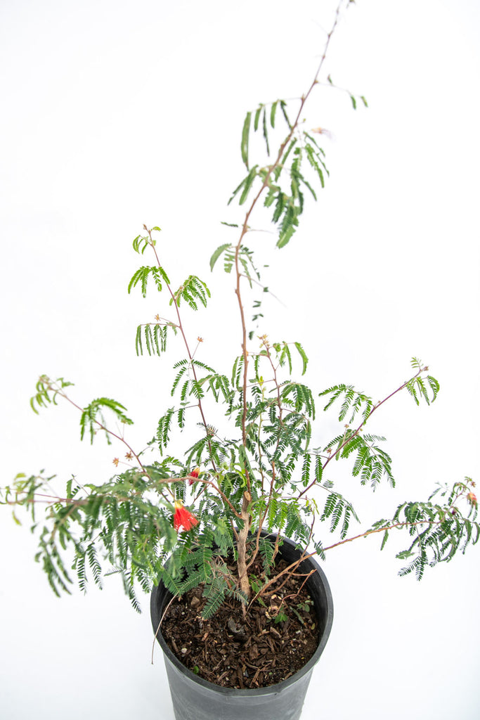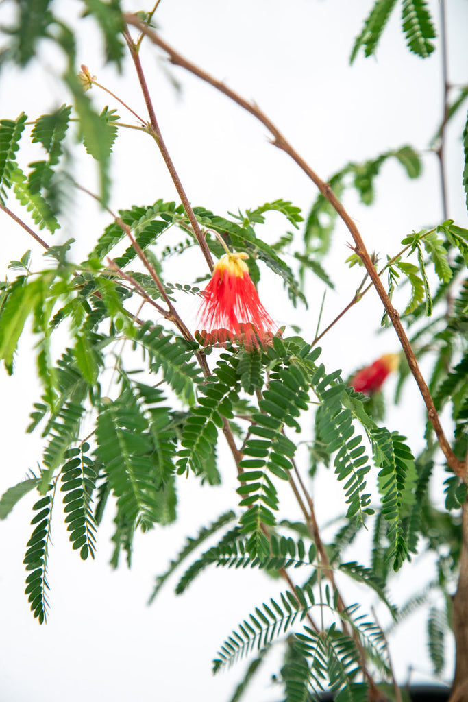 A large, fast-growing, drought-tolerant, semi-evergreen shrub with dark green, fern-like leaves that hold up a dramatic explosion of red flowers in spring to summer. One of the first to bloom, brightening the garden and attracting butterflies and hummingbirds. Dark green compound leaves on upright vertical brown stems. Easy to grow. Adaptable. Heat tolerant for transition or xeric/hot landscape zones.