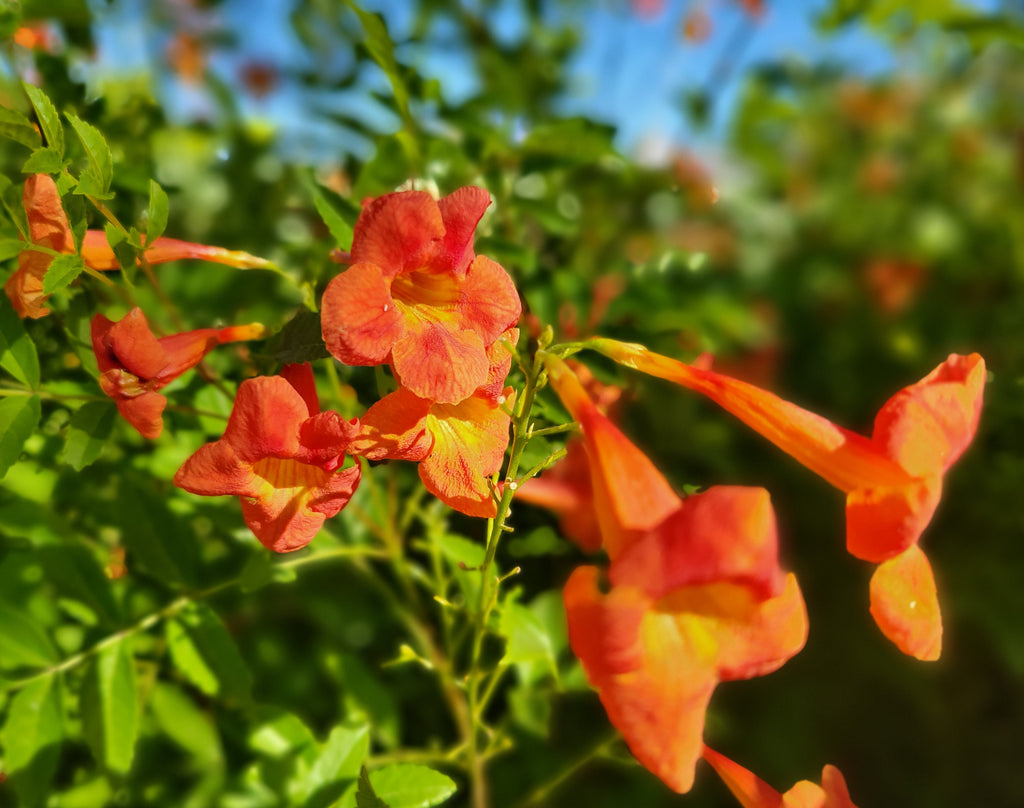Red Bells is a fast-growing, well-behaved, heat-tolerant, colorful blooming shrub. The bright flowers are medium-sized, bell-shaped, dark orange to nearly red, that are formed in large clusters at the branch tips. Leaves are dark green. They provide flushes of blooms from spring to fall. Plants can freeze back with temps around 25-30°F, but will recover quickly after stems are cut back to the ground. They are root hardy to around 10°-15°F. We got starts of this plant years ago from our good friend and Tecoma breeder, George Hull, who was an adjunct professor at ASU. Red Bells is a semi-dwarf, sterile hybrid, which keeps them blooming longer and they rarely produce any dirty seed pods.