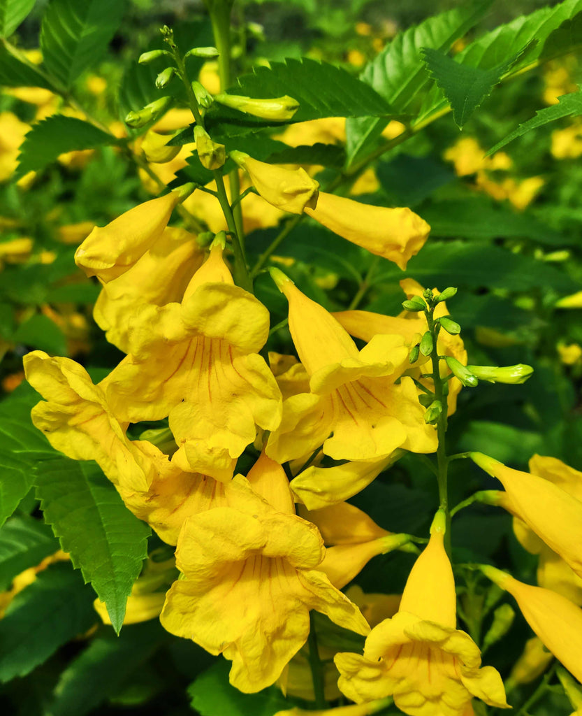 Yellow Bells is a fast-growing, large shrub for a screen or tall blooming hedge. The flowers are large bright yellow and form in large clusters. These flowers are followed by long seed pods that are easily removed to help extend the blooming period. Yellow Bells are susceptible to freezing in the coldest weather but don’t worry, because they will recover quickly when temperatures warm up. They can be easily trained into decorative patio trees.