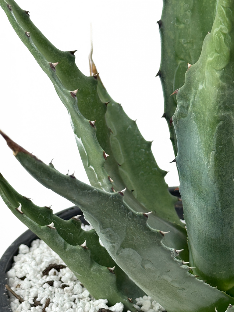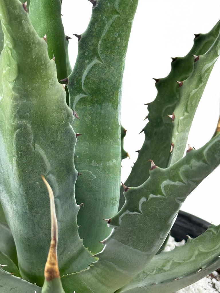 Dark green Agaves, well-armed lance-shaped leaves with grey marginal teeth and long terminal spines. They grow large, maturing to 3-4ft. tall and 4-6ft. wide tip to tip. Cold hardy to around 5°F. Occur from 6,000ft. to 9,000ft. in pine and oak woodlands or high chaparral of northern and NE Mexico. Their natural adaptations make them a good option for colder, wetter regions as long as the soil drainage is enhanced. They can tolerate shade and prefer it in the hottest parts of our low desert. (previously Agave macroculmis)