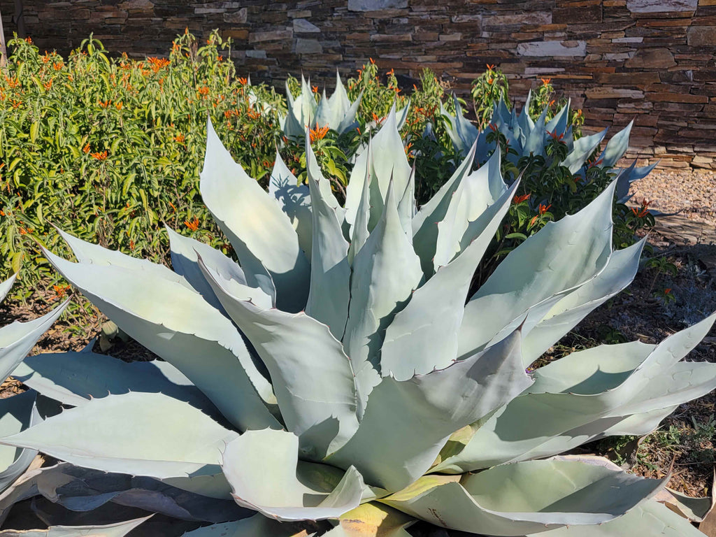 Frosty Blue Whale's Tongue forms a similar shape and size as the straight species with wide, deeply guttered leaves that often exhibit some wavy linear undulations that will make you swear you’re looking right into Shamu’s mouth! But 'Frosty Blue' has a brighter, powder blue color than its cousin. It has the same hardiness and adaptability as the regular Agave ovatifolia.