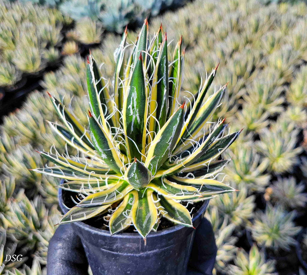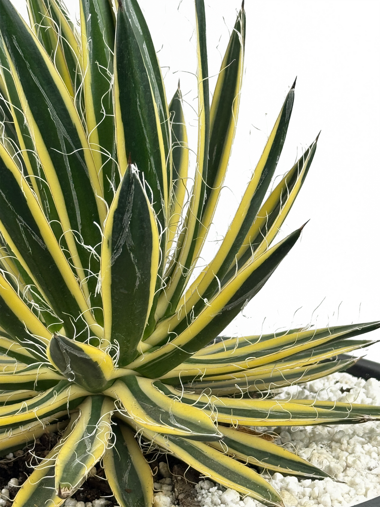 Compact and slow-growing, Royal Flush Agave has dark green, strap-like, short leaves that end in a small terminal spine. They have a beautiful cream to golden-colored variegation. The hairy leaf margins tear off to give the agave an adorable fuzzy appearance. This agave is heat-tolerant and low-maintenance.